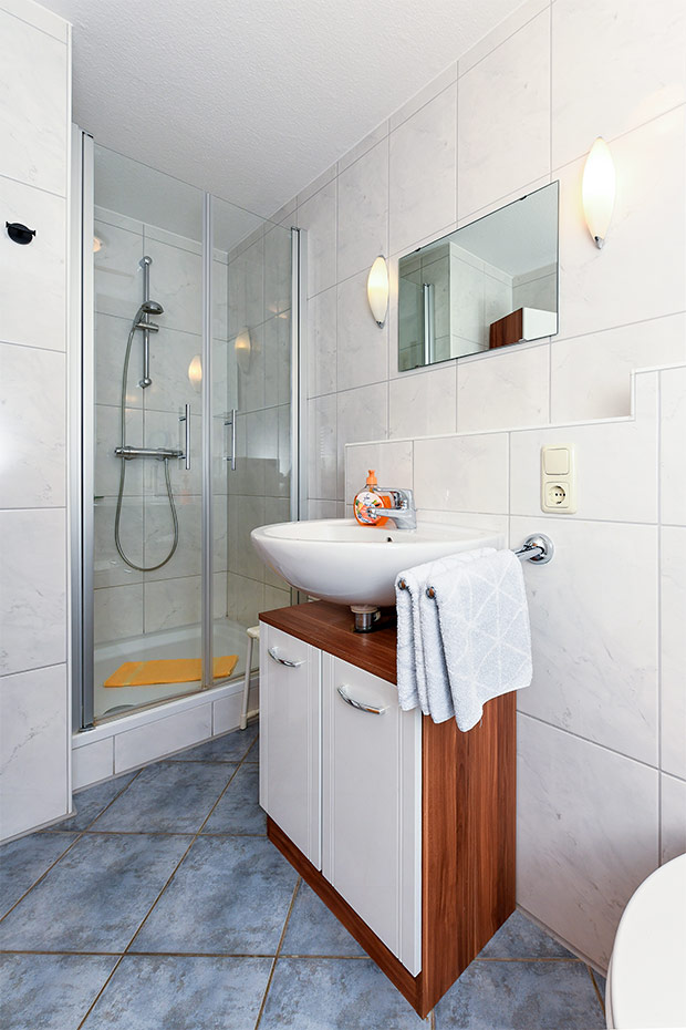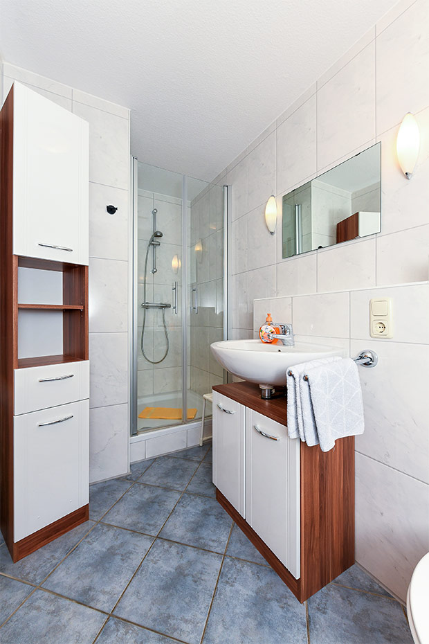 - Badezimmer mit Dusche, Waschtisch und WC
